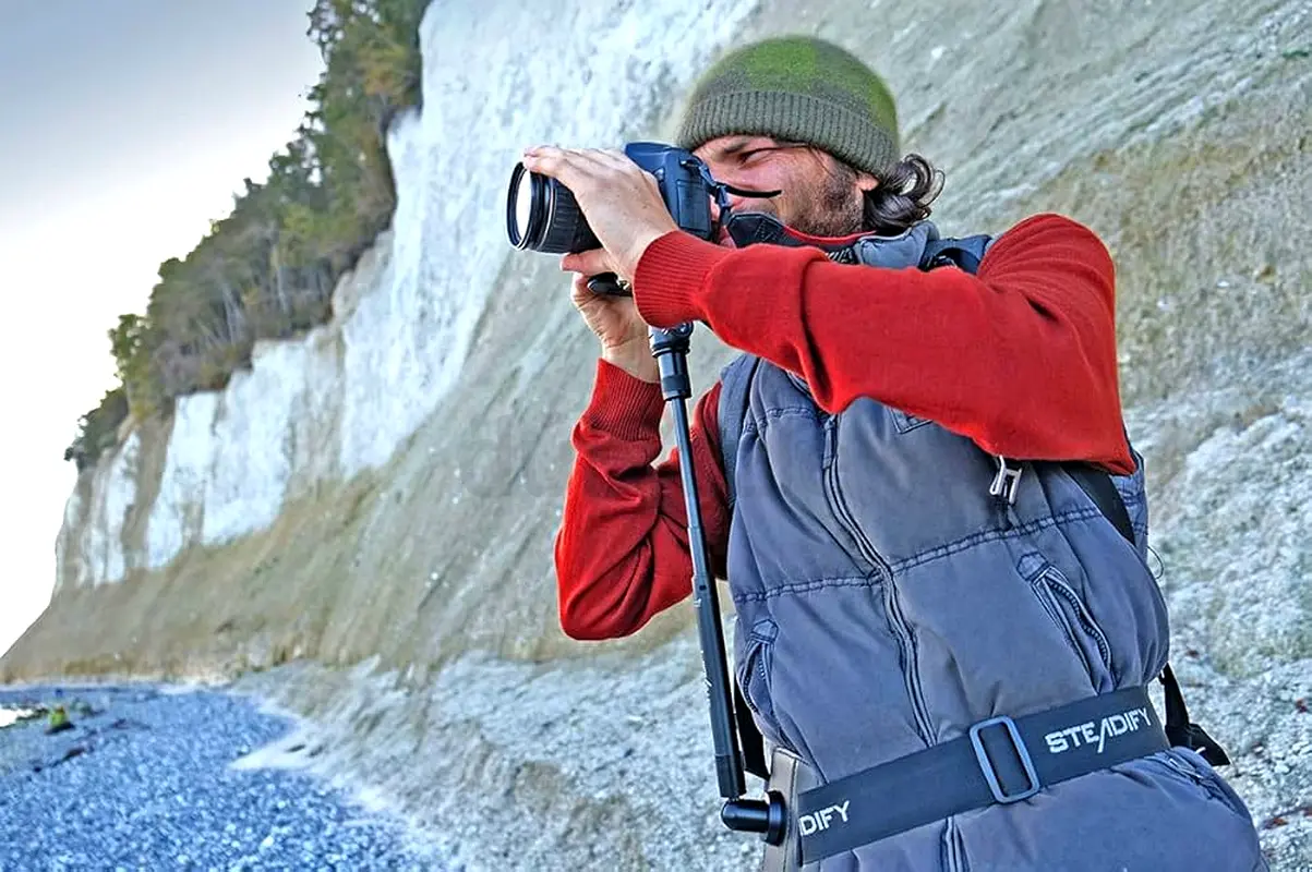 Steadify is a body tripod, it is worn close to the body and allows stability from the hips, which means total freedom of movement for photographers, filmmakers, nature observers. With a single swipe it is activated, so you don't miss a chance for brilliant shots. Steadify also completely compensates for the weight of cameras, gimbals and binoculars, offering the luxury of endless standby without any effort.