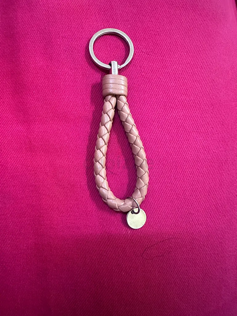 I'm selling a braided genuine Bottega Veneta leather loop keychain in light pink. Excellent condition with no marks or fraying. It has a sturdy metal split ring and a small round metal tag. It's compact and handy for holding keys or attaching to a bag as an accent.