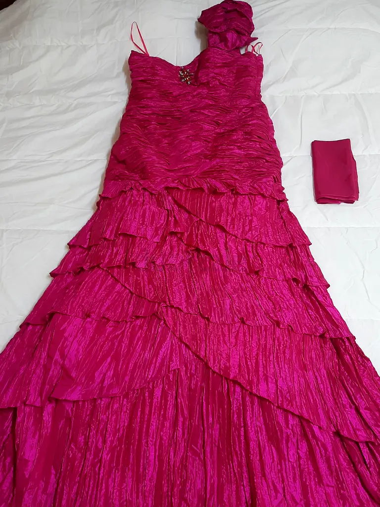 I’m selling a fuchsia ruched evening gown with a matching shawl. I wore it once for a wedding; it’s essentially like new and in excellent condition. The dress features a fitted ruched bodice with thin straps and decorative detailing at the waist, flowing into a tiered, textured skirt that creates a flattering silhouette. The matching shawl is included and shown in the photos. Size listed as XL and the dress is about 0-1 month old from purchase. Comfortable for formal events and easy to pair with simple accessories.