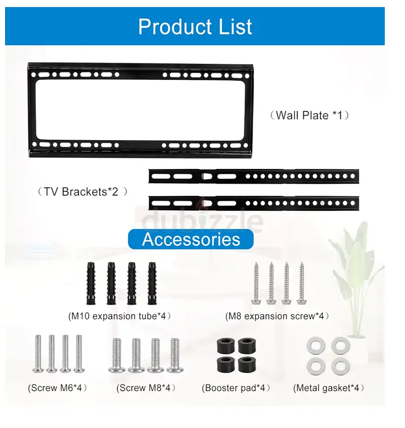 - Includes: Wall plate, 2 TV brackets, M10 expansion tubes (×4), M8 expansion screws (×4), Screw M6 (×4), Screw M8 (×4), booster pads (×4), metal gaskets (×4)
