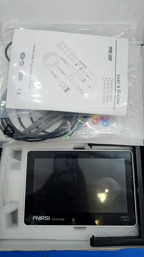 I'm selling a brand new, never-used Fnirsi 7-inch digital oscilloscope (100MHz) in flawless condition. It's a portable unit with a 7-inch color LCD and a 100MHz bandwidth, suitable for basic electronics diagnostics, hobbyist projects, and field work. The scope supports 1 GS/s sampling rate, 100x high voltage probes, and multiple trigger modes (Auto, Normal, Single). It also offers storage and waveform output via USB. The unit comes without warranty and has never been powered on or used.