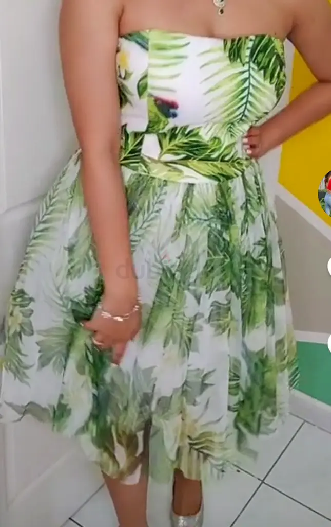 strapless green tropical print midi dress in size M. I bought it recently and wore it once for an event, so it’s in excellent condition with no stains, tears, or signs of wear. The dress has a fitted bodice with a structured top and a full, flowy skirt made of lightweight sheer fabric with a leafy tropical pattern and a lining underneath. It fastens at the back (zip) and sits around mid-calf length. It’s perfect for summer parties or a beach wedding.