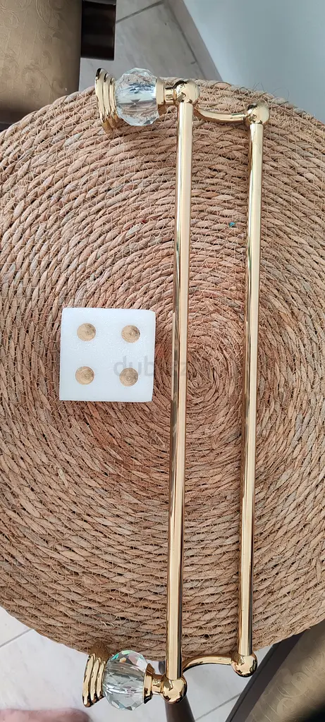 I'm selling a brand new, never used gold double curtain rod set with crystal finials. It's in flawless condition and has clear crystal finials on each end. The set includes the two parallel rods for double curtains plus the mounting brackets and hardware shown in the photos.