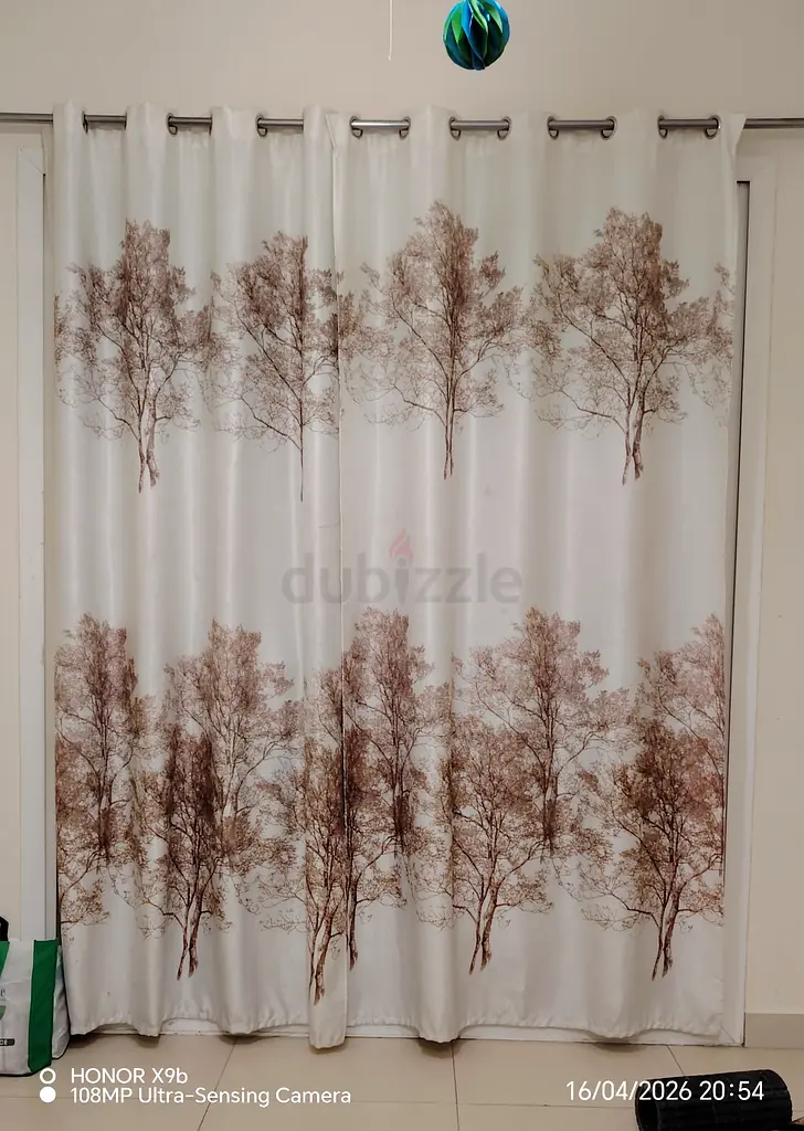 I'm selling a pair of beige/white curtains with a brown tree print. They have an eyelet/top ring header so they're ready to hang on any standard curtain rod. I bought them about 1–2 years ago and they've been used in a living room with normal, careful use; overall condition is good with no visible stains or tears. The fabric provides moderate light filtering while keeping some privacy. Comes as shown in the photos, ready to install.