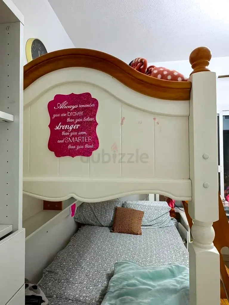 I’m selling my IKEA white and wood bunk/single bed frame. It’s about 2–5 years old and in good condition with normal signs of use — a few minor scuffs and small marks but structurally solid. The bed can be used as a bunk or configured as a single lower bed (mattresses not included). The top frame has a wooden trim and turned posts with a white painted panel finish. I’ve kept it well maintained and it’s stable and sturdy for daily use. Collection only from my place.