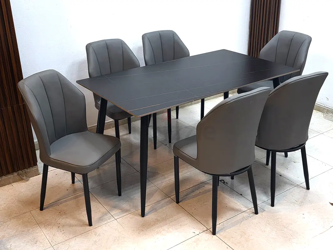 I am selling a brand new, never-used modern 6-seater dining set in dark grey. The set includes a rectangular dining table with a smooth dark grey top and sturdy black metal legs, plus six upholstered chairs with padded seats and backs in matching grey faux leather. The chairs have vertical seam detailing and slim black legs. The condition is flawless — assembled for photos only. This set fits well in contemporary dining rooms and offers comfortable seating for six.