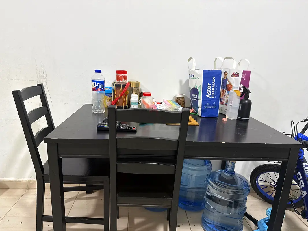 I'm selling a used black wooden dining table with two matching chairs. I bought it about 6–12 months ago and it's in good condition with normal signs of use like minor surface scratches. The set comfortably seats up to four people but currently has two chairs. It's a compact rectangular table that fits well in small dining areas or kitchens. The tabletop is sturdy and stable; legs are solid with no wobble. I'm including it as-is — a practical, simple piece if you need a basic dining setup.