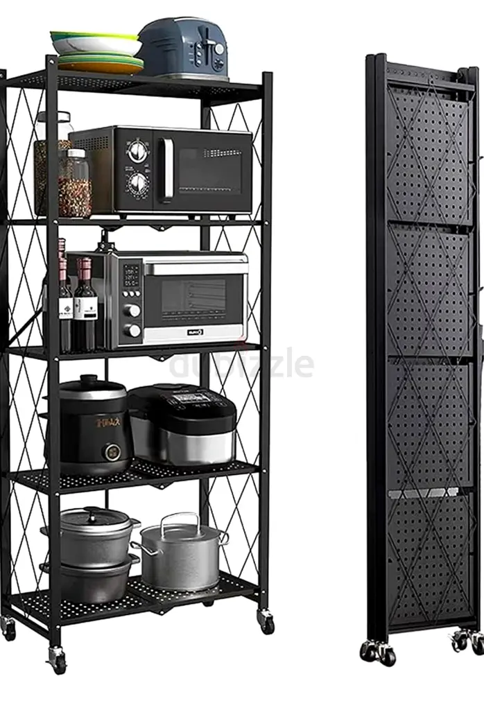 I'm selling my foldable 4-tier rolling kitchen storage shelf. It's brand new, never used and in flawless condition. The unit is black and requires no assembly — you simply unfold it to use. It rolls on casters for easy movement and is great for extra pantry storage, holding a microwave, or organizing cookware and supplies.