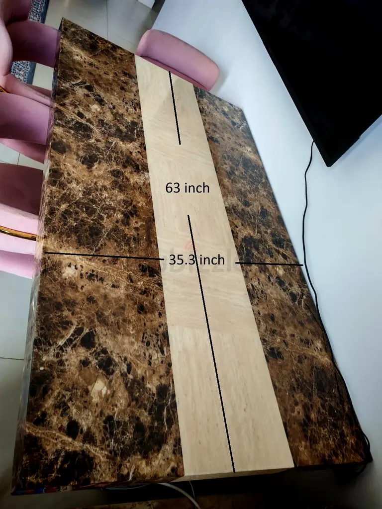 I'm selling a rectangular dining table with a marble-effect top that I've used for about 1–2 years. It's in good condition with normal everyday use and comfortably seats six. The table is brown and measures 63 x 35.3 inches.