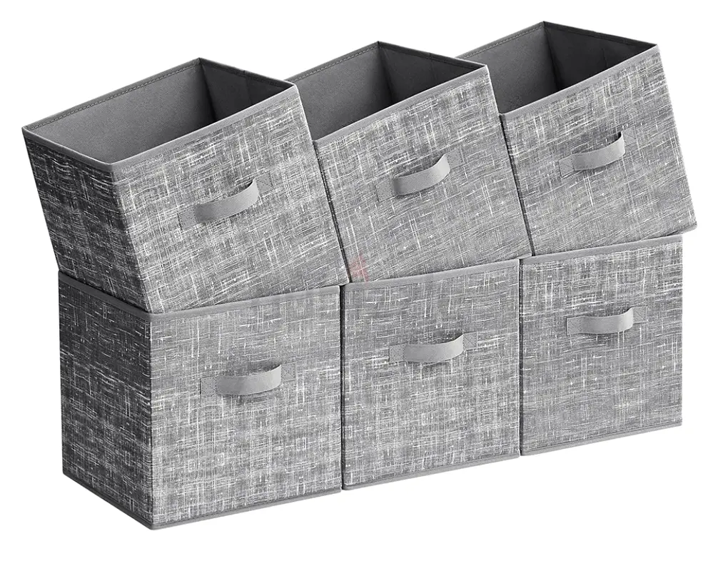 I'm selling a set of 6 grey fabric storage bins (foldable cubes) that I've used lightly for about 1–2 years. They are in excellent condition with no stains, tears, or structural damage. Each bin has a front carry handle and a reinforced base so they hold shape when in use, and they fold flat for storage when not needed. The neutral grey fabric with a subtle woven texture fits easily into shelves, cube organizers, closets, or as standalone storage for toys, clothes, accessories, or office supplies. Pick-up in UAE only.