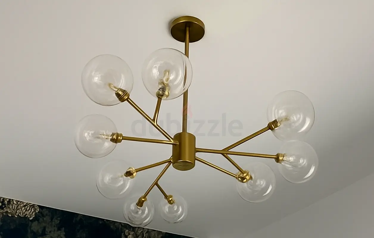 Illuminate your living space with this stunning modern chandelier featuring a sleek gold finish and nine exquisite glass globes. This brand new light fixture promises flawless elegance and sophistication, making it a perfect addition to any contemporary home, it will shine brightly in any room, creating a warm and inviting atmosphere. Don't miss this chance to enhance your home décor with this eye-catching piece of artistry.