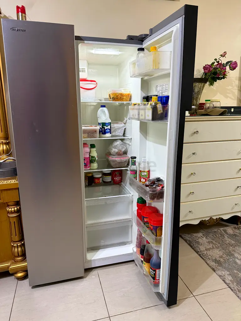 * Brand: Panasonic * Type: Side-by-Side (Double Door) * Technology: Inverter (energy saving & low noise) * Cooling: Fast cooling with even air distribution * Display: Digital touch control panel * Temperature Control: Adjustable fridge & freezer settings * Design: Modern stainless steel finish * Condition: 100% working, minor cosmetic marks (as shown in picture)