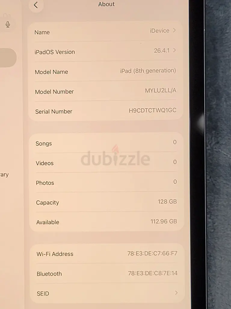 I'm selling my Apple iPad (8th generation) in Space Grey. It's about 1 year old, 128GB storage with 4GB RAM, and is in good pre-owned condition with no damages. It has a valid warranty remaining. Battery and touchscreen work fine, and it runs the latest compatible iPadOS. Comes with the tablet only (no accessories shown). Ready to use and reset to factory settings upon sale.