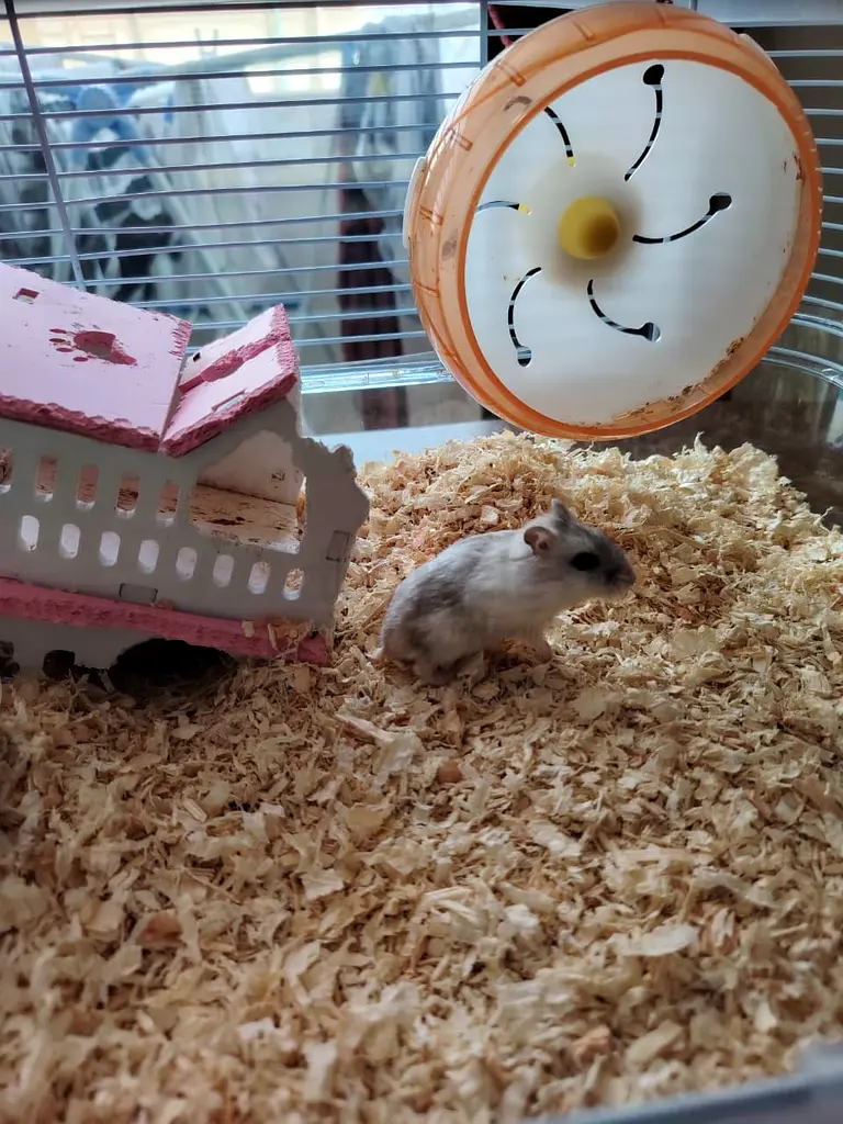 I’m selling a collection of dwarf hamster cage accessories that I used with my neutered dwarf hamster. Included are a plastic running wheel (orange/white), a wooden hideout/house, and natural wood shavings bedding already in the tank. Everything is used but in good, functional condition — wheel spins fine, hideout shows some chew marks, and bedding is fresh. Cage itself is not included, just the accessories shown. Available for immediate pickup.