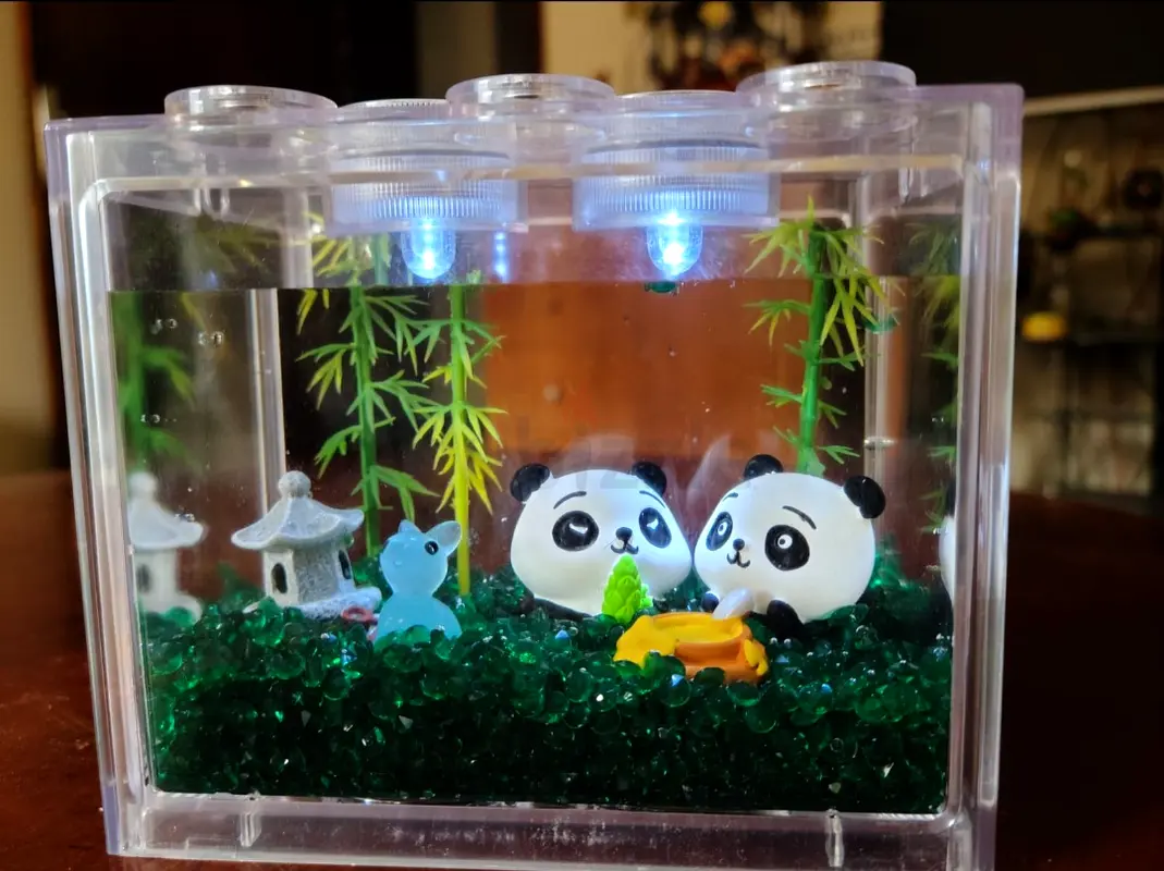 This is a brand new Panda Mini Aquarium Toy Set, perfect for young children to explore their imaginative play. It features adorable panda figures, a small pond, and colorful decorations, all enclosed in a clear aquarium-like structure. The toy is designed to create a soothing atmosphere with integrated lights that illuminate the scene. This set has never been used and is in excellent condition, making it a great addition to any child's toy collection.