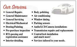All services for your car. Updates through WhatsApp. Easy thorough communication. Book your visit today.