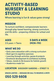 Activity-Based Nursery & Learning Studio — Now Open in Discovery Gardens! A warm, fun, and nurturing space where children learn, explore, and grow holistically.