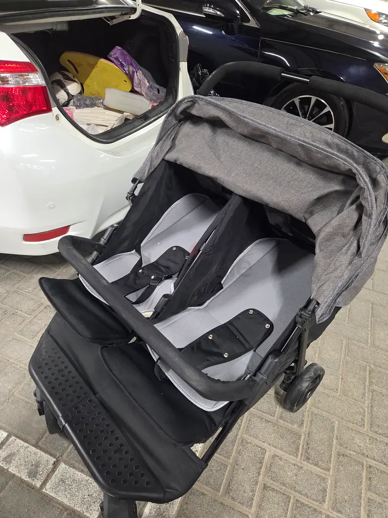 I’m selling my lightweight side-by-side double stroller. I’ve used it for about 1–2 years and it’s in good condition with normal signs of use. It has two roomy reclining seats that can be reversed to face either direction, multiple recline positions, and a large UV-protection canopy that extends well to shield both children. The frame is lightweight and designed for one-hand folding with a compact fold for easy storage and transport. There’s a roomy storage basket underneath, adjustable handlebar, and all-terrain wheels that handle curbs and uneven pavements without trouble. Seat harnesses are intact and the fabric is clean with only minor wear from regular use.