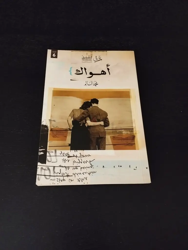 This is a paperback book titled "أهواك". It has been used normally and is in good condition despite being over 10 years old. The cover features a couple in a nostalgic pose, hinting at themes of love and relationships. The pages are well-maintained, and the binding is intact, making it a great read for anyone interested in Arabic literature.