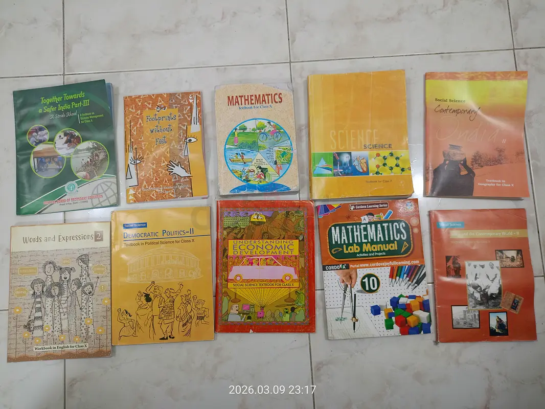 Selling a complete set of Class 10 NCERT textbooks. These books have barely been used and are in pristine, like-new condition with no markings or torn pages (except for the Mathematics book which saw light use).