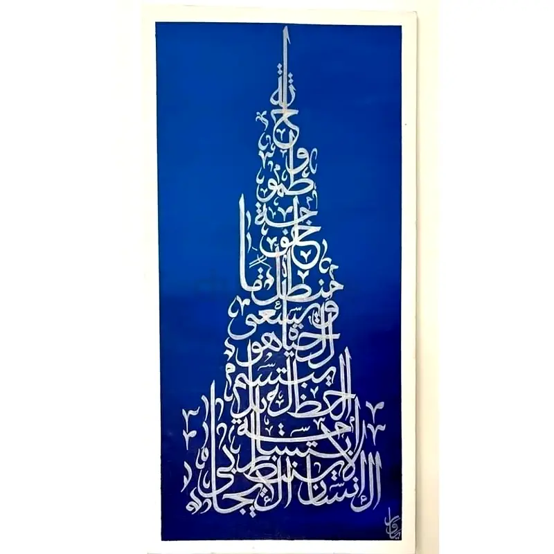 I'm selling a stunning piece of calligraphy artwork on a beautiful blue canvas. This artwork features intricate and elegant Arabic calligraphy that really catches the eye and adds a unique touch to any space. Content is saying of His HighnessShaikhMohammadBinRashidAlMaktoum traced in calligraphic form of Burj Khalifa. This piece is perfect for art lovers or anyone looking to add a touch of culture to their home. Whether displayed in a living room or a study, it serves as a perfect conversation starter. Don't miss the chance to own this exquisite artwork!