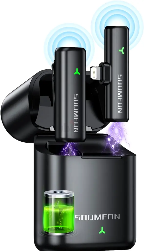 Wireless Lavalier Microphone for iPhone iPad: This wireless microphone set includes 1pc microphone, 1pc transmitter and charging case. It's easy to use, plug and play, just plug in the receiver into the lightning port device, then it will automatically connect with the trasmitter. No APP or Bluetooth required.