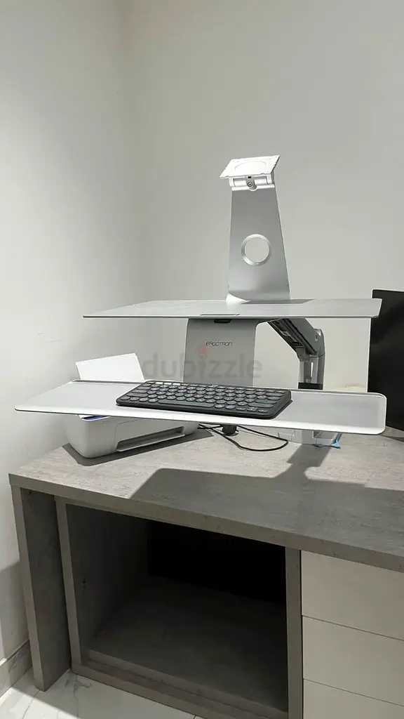 I am selling a height adjustable standing desk converter that is brand new and in flawless condition. It comes in a clean white color, perfect for any modern workspace. This converter has never been used and allows you to easily switch from sitting to standing while working, promoting better posture and comfort. It features a spacious top shelf for your monitors and a lower shelf for your keyboard or other accessories. Ideal for anyone looking to enhance their productivity.