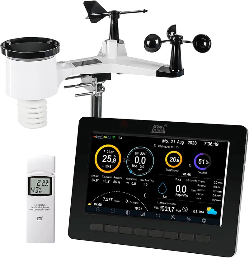Brand DNT Recommended uses for product Home Specific uses for product Temperature Power source Battery and Solar Powered Special features Alarm Material Kunststoff Powerful WiFi weather station for measuring indoor/outdoor temperature, indoor/outdoor humidity, rain quantity, wind direction/strength, air pressure and brightness WiFi weather station with brilliant 17 8 cm TFT colour display Room climate detection of up to 9 rooms possible (with additional sensors ASIN B) Battery-powered combi solar outdoor sensor with integrated solar panel for power supply Individual alarm settings possible thunderstorm warning temperature humidity felt temperature dew point rain wind speed air pressure storm gusts Weather data recording with selectable intervals as well as tabular and graphic evaluation Weather data can be viewed at any time via app (iOS & Android) Compatible with IFTTT (i.V.m. Weather Underground and much more.)