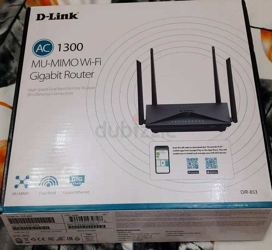 I'M selling a D-Link DIR-853 AC1300 MU-MIMO Gigabit Router. It's brand new, never used, and in flawless condition, coming in the original retail box. This is a dual-band AC1300 router with MU-MIMO support and gigabit Ethernet ports — suitable for home or small office use. No warranty applies. Selling as-is in the boxed condition.