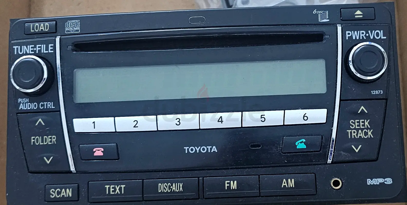 I am selling a genuine Toyota OEM car stereo head unit made of steel that fits older Toyota Camry corolla like models. It's about 5–10 years old and in flawless working condition with light usage. Features include AM/FM radio, 6 CD player with MP3 support, preset buttons (1–6), Scan/Text display, Disc/Aux input, Tune/File and Seek/Track controls, PWR-VOL knob, and a front 3.5mm aux jack. The unit has the original button layout and display; cosmetic condition is very good with normal minor signs of age. No warranty and sold as-is. I have tested it and all functions (radio, CD playback, MP3 read, volume and tuning controls, presets and aux) work fine. Suitable for replacing or upgrading compatible Toyota factory stereos.