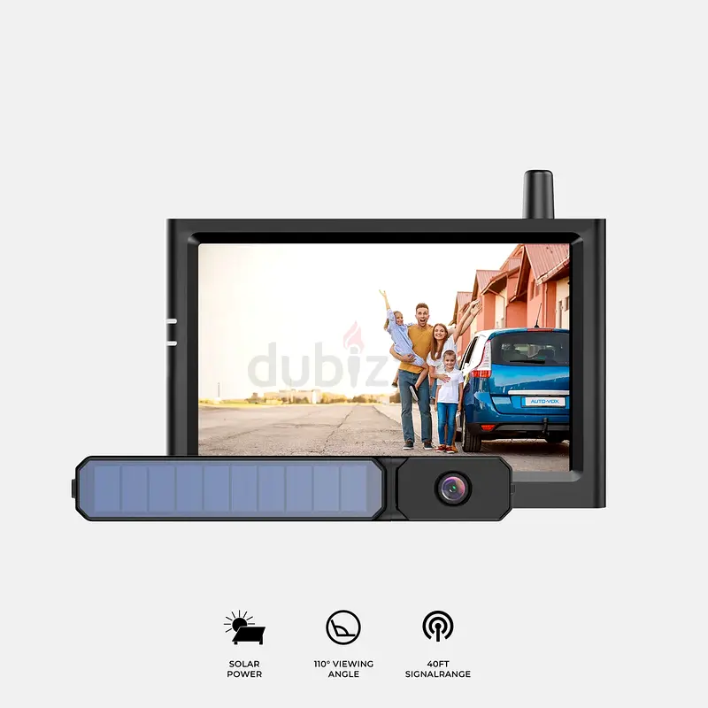 Auto Vox Solar1 Pro is a completely wireless backup camera designed for outdoor activities, powered by a rechargeable battery with solar power to extend battery life. It features AUTO-VOX's patented split-type wireless lens waterproof structure, easy wire-free DIY installation, and a 5” HD monitor for safe driving and parking.