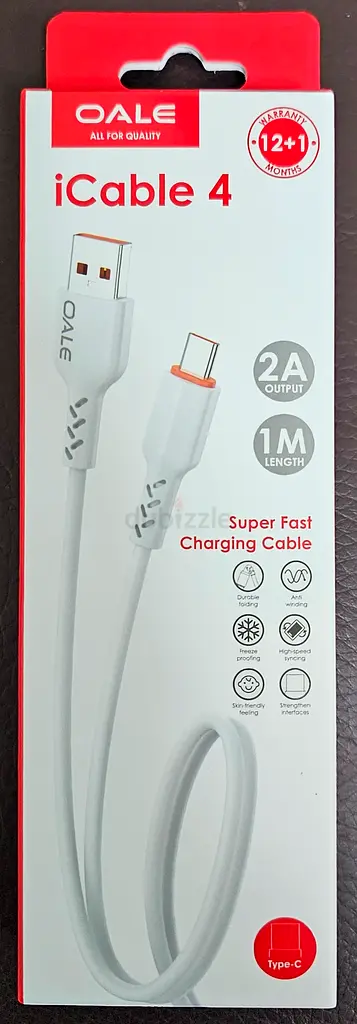 I'm selling my brand new OALE iCable 4, a super fast charging cable that I never got to use. It’s in flawless condition, perfect for anyone needing a reliable charging solution for their devices. This 1-meter cable supports a 2A current, ensuring efficient and quick charging. With a Type-C connector, it’s compatible with a wide range of modern devices. Plus, there's a warranty included, so you can buy with confidence!