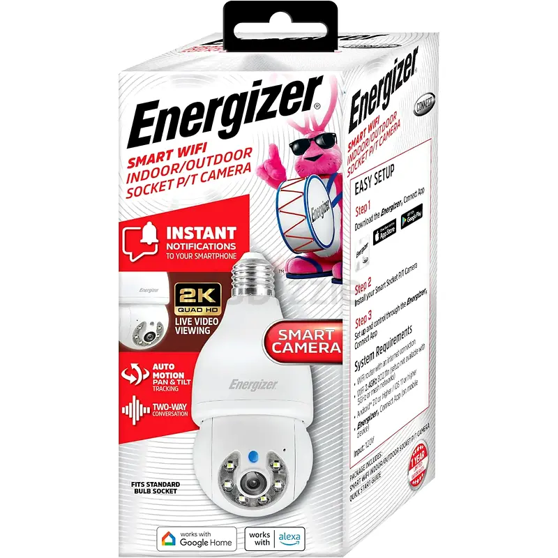 Energizer Smart Outdoor 2K Security Socket Camera with Auto Motion tracking, 2-Way Audio, Night Vision, Pan and Tilt, Instant Alerts, Google Home, Alexa, Voice Control, E26 Base