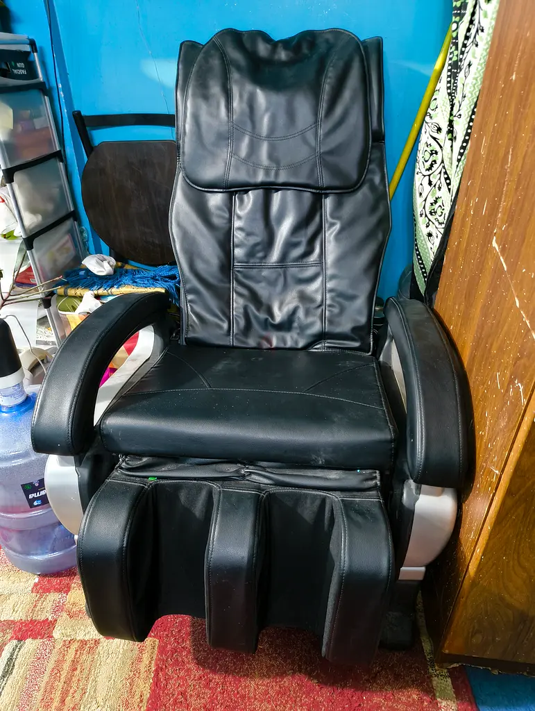 I'm selling a comfortable black leather massage chair. It's in average condition, showing some normal signs of usage but still functions well. This chair is perfect for relaxing after a long day. It offers a soothing massage feature that helps relieve tension and stress. It's a great addition to any living room or home office.