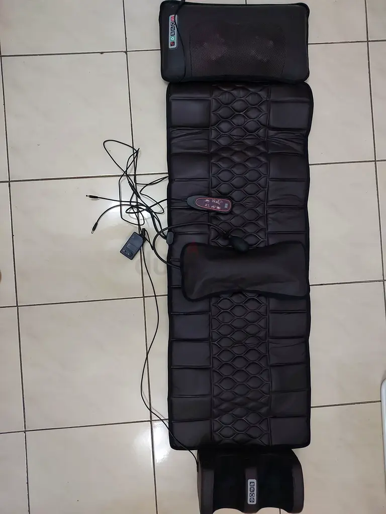I'm selling a full-length electric massage mat in brown that I bought about 2 months ago. It's in beand new condition with one time usage — no tears or major wear. The mat includes a detachable neck pillow as well as foot massager and an easy-to-use wired remote to control vibration modes and intensity. It plugs into mains and the power adapter and cables are included. The surface is padded faux leather and cleans up easily. It lays flat for use on the floor or on a bed and provides full-back coverage from shoulders to lower back.