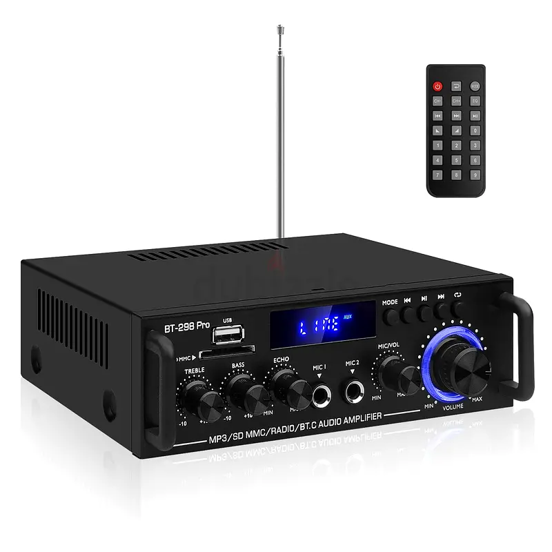 Product description BT-298Pro HiFi Stereo Verstärker 50W+50W Max. 600 W output output 2.0 kanal Bluetooth 5.0 mini audio output converter (BT-298A battery version) Merkmale: 1. Bluetooth5.0 RCA SD USB-Eingang, 2.0-Kanal-Stereo-Ausgang, nur wenig Klangverzerrung. 2. Hifi sound quality, werden Sie eine perfekte Klangqualität Erfahrung genießen. 3. Mikrofonlautstärke und Lautstärkeregler, Höhen- und Bassregler. 4. Mit 2 Mic-Buchsen, können Sie Karaoka zu Hause singen. 5. Mit Fernbedienung und US-Stecker für einfache Bedienung. 6. U-Disk und Speicherkarte lesen, Plug and Play. 7. Mit FM-Fraktion BT-298Pro Audio-Verstärker weit kompatibel mit Mobiltelefonen, Computern, Tablets, Notebooks, MP3, MP4, TVs und Projektoren mit AV-Audio etc. Verwenden Sie Gelegenheit: BT-298Pro Audio-Verstärker ist weit verbreitet Einsatz im Innen- und Außenbereich, Wie Familie, Party, Bar, Konzert, Karneval etc. Specific features: Product name: 2.0-Kanal-Bluetooth-Audio-Leistungsverstärker Product model: AK45 Version: Bluetooth 5.0 (5 Meters Wenn Ungehindert) Eingangs-Empfindlichkeithkeititithkeititten : 500 m V signal output voltage: >80dB Frequency: 20-20KHZ Verzerrungsgrad: ≤0.3% Audio-Eingang: BT RCA SD USB Kanal: 2. 0CH FM-Fraktion: Understützung Angepasster Lautsprecher: 30 W und mehr, 4-16Ω Operating power: DC12V/5A, AC 90V-240V, 50-60Hz Output: Nennleistung: 50W-50W, Spitzenleistung: 3000W. W+300 Product size: 7. 1 x 5.4 x 2.7 inch Package weight: 1.76 lb Package contents: 1 x BT-298 Pro audio output 1 x remote control 1 x EU connector 1 x FM antenna