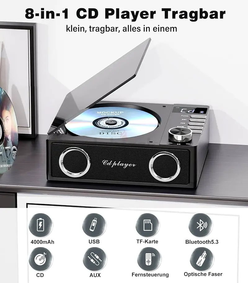 【Bluetooth 5.3 Technology for Faster Connections and Reads】With the cd player bluetooth receiver, the bluetooth cd player can connect to your phone, tablet, and computer. The CD player with bluetooth transmitter, you can stream sound to wireless headphones, earphones, and bluetooth speakers.