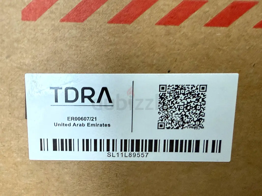 I am selling a boxed TDRA-certified electronic unit; the TDRA label is visible in the photo (ER00607/21, United Arab Emirates). The unit is brand new, never used and in flawless condition. The box is sealed and there is no applicable warranty. The TDRA sticker and barcode/serial (SL11L89557) are shown in the images for verification.