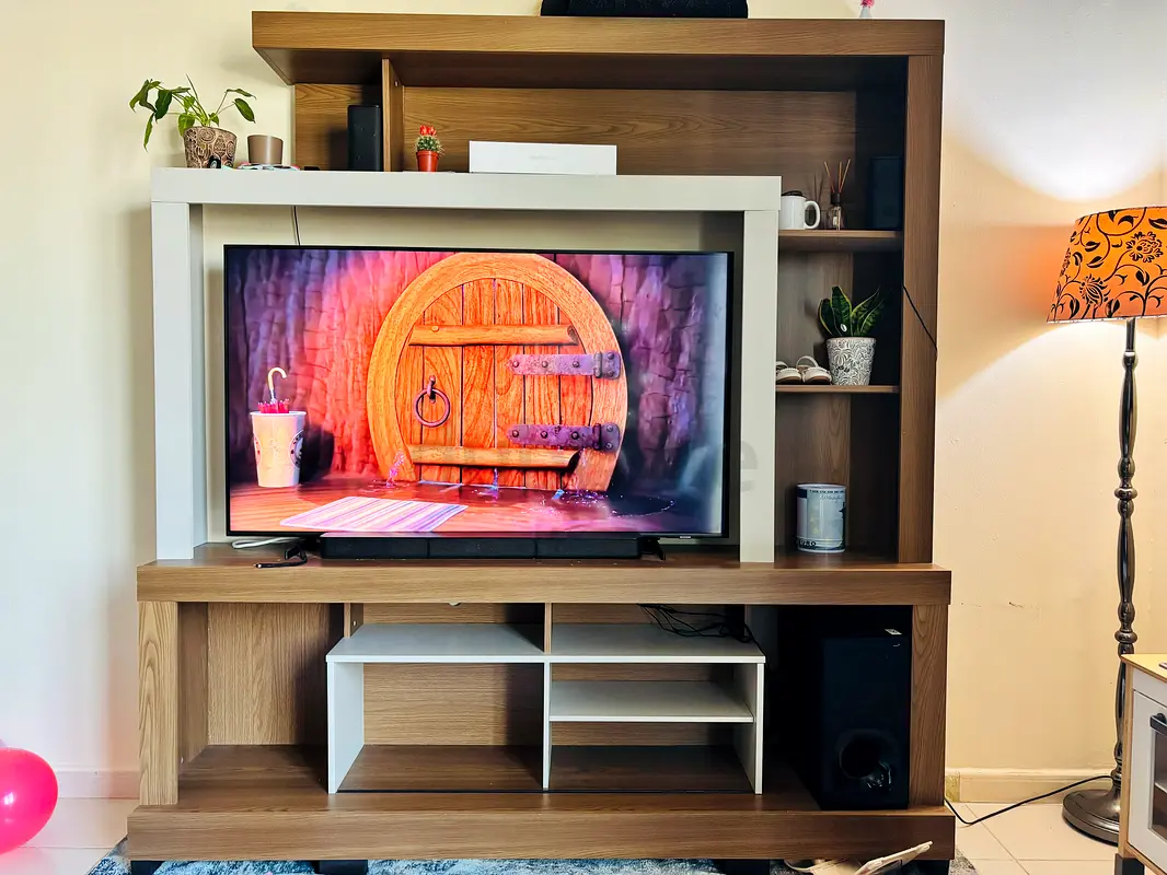I’m selling my stylish entertainment center that's perfect for any living room. It's about 3 month old and in good condition, showing normal signs of usage. The rich brown color complements the modern design, featuring open shelves that provide ample space for your favorite books, decorative items, and electronics. It also accommodates a TV quite beautifully, creating a cozy focal point in the room. This versatile piece can blend seamlessly with various decor styles while offering practical storage solutions.