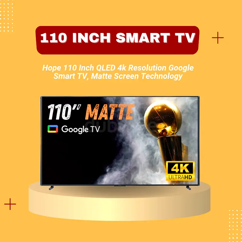 110 Inch QLED 4K Smart TV – Experience stunning visuals on a massive 110-inch display with QLED 4K resolution. The matte screen technology reduces glare for a clearer, more comfortable viewing experience. Powered by Google Smart TV, enjoy seamless streaming, apps, and voice control for the ultimate entertainment at home.