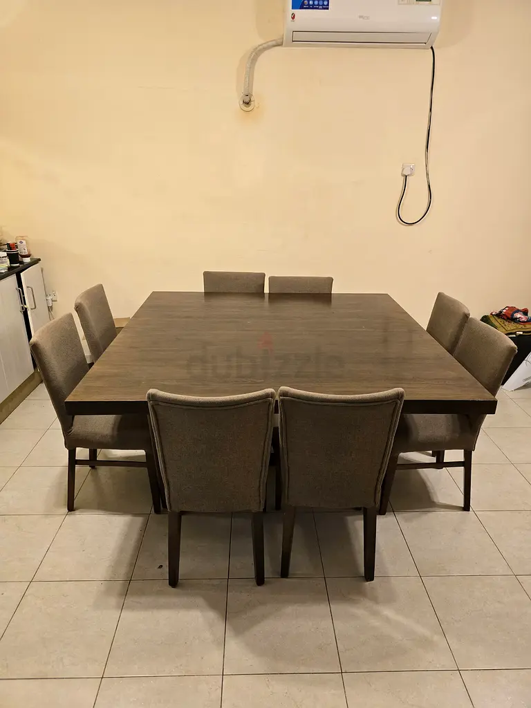 I'm selling a stylish rectangular dining table with 8 matching chairs. This set is perfect for family gatherings or dinner parties. The table and chairs are in good condition and have been used normally. The color is a nice brown, adding a warm touch to your dining area. With a seating capacity of 8, everyone can enjoy meals together. The square shape of the table fits well in various dining setups, making it versatile for any home.