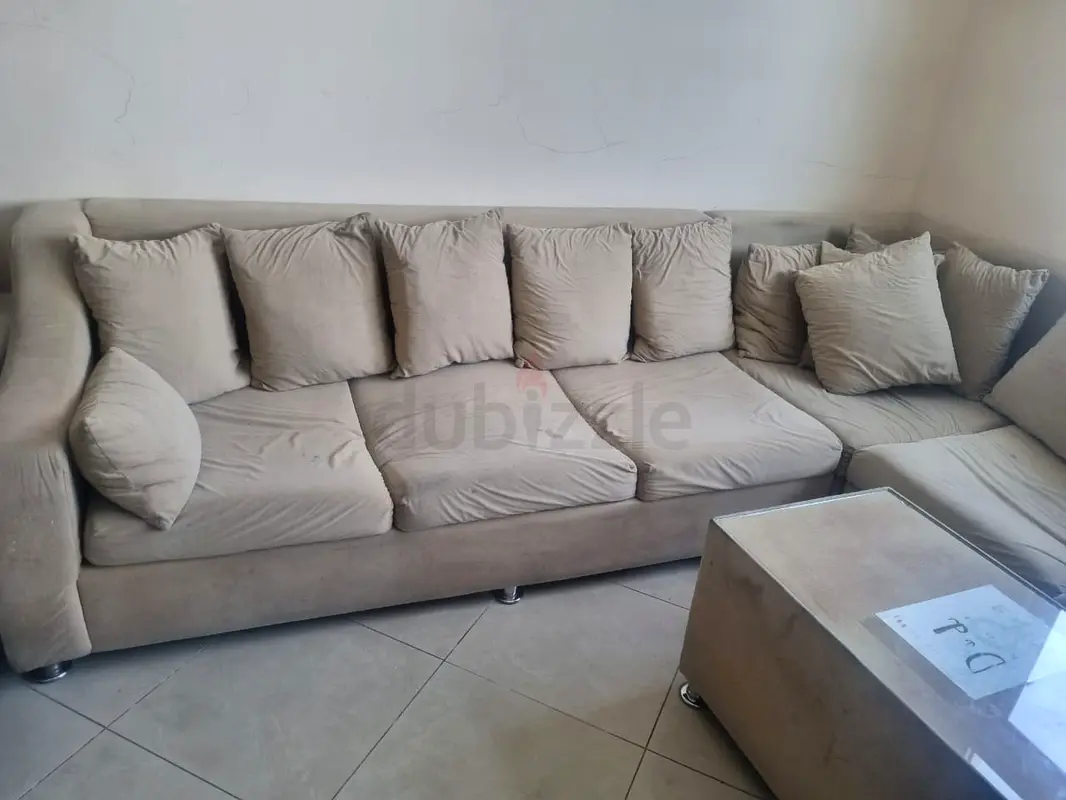 Heavy Duty Light beige L-shaped fabric sofa with matching Coffee Table. It’s about 2–5 years old and in good condition with normal everyday use. The seating is comfortable with removable seat cushions and several loose back cushions for support. The fabric shows minor signs of use, no major stains, tears, or structural damage. Frame and legs are sturdy. Suitable for a family living room or lounge area.