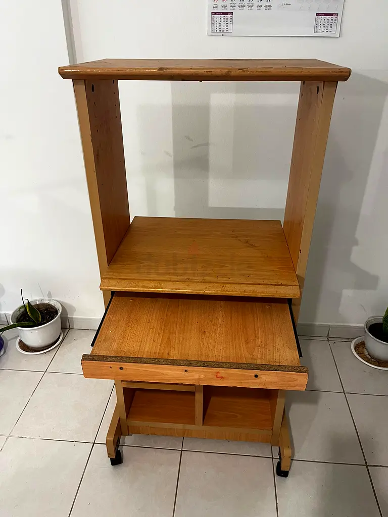 I'm selling a sturdy wooden study table with rolling wheels that has served me well! It's perfect for children aged 2-5 years, with a decent size and a lovely brown finish. The table has a rectangular shape, featuring a spacious top surface, a pull-out drawer, and a couple of open compartments underneath for storage. While it's in average condition, it functional and adds a punch of character to any study space. The rolling wheels make it easy to move around, perfect for kids who like to change things up.