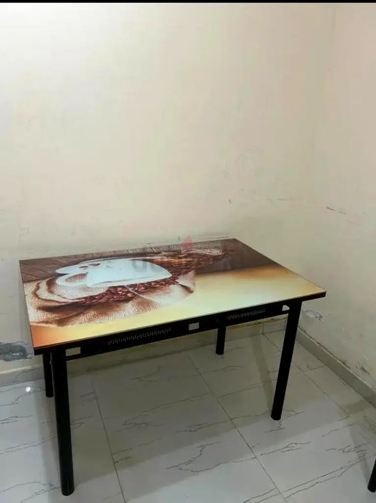 I'm selling a rectangular dining table with a printed glass top and black metal legs. I bought it about 1–2 years ago and it's in good condition with normal everyday use. The top has a brown-toned printed design on tempered glass that cleans easily; the frame and four legs are sturdy metal finished in black. It comfortably seats four people and is suitable for a small dining area or kitchen. Minor surface marks consistent with normal use but no structural damage.