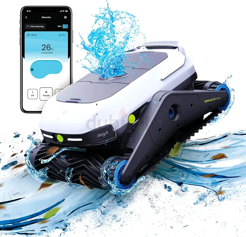 The Degrii Zima Pro is a high-performance, cordless robotic pool cleaner notable for being the first to utilize ultrasonic radar for 3D path planning and mapping. It features a unique floating battery system that separates the heavy 10,000 mAh battery from the main unit to improve energy efficiency and maintain a stable Wi-Fi/Bluetooth signal even underwater