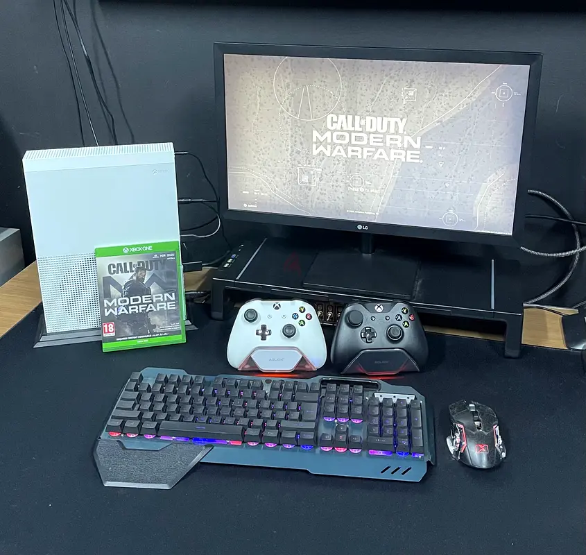 1. Xbox One S with the box 2. LG monitor 3. Xbox fan 4. Xbox stand holder 5. Two controllers with charging batteries and docking 6. RGB Mouse and Keyboard 7. One game ( call of duty modern warfare)