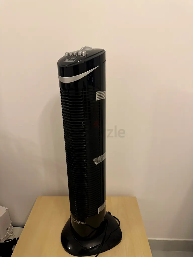 I'm selling a black tower fan that provides efficient cooling for your home. This fan is in excellent condition and has never been used. It’s perfect for keeping your living space comfortable during hot days. With its sleek design, it easily fits into any corner of your room.