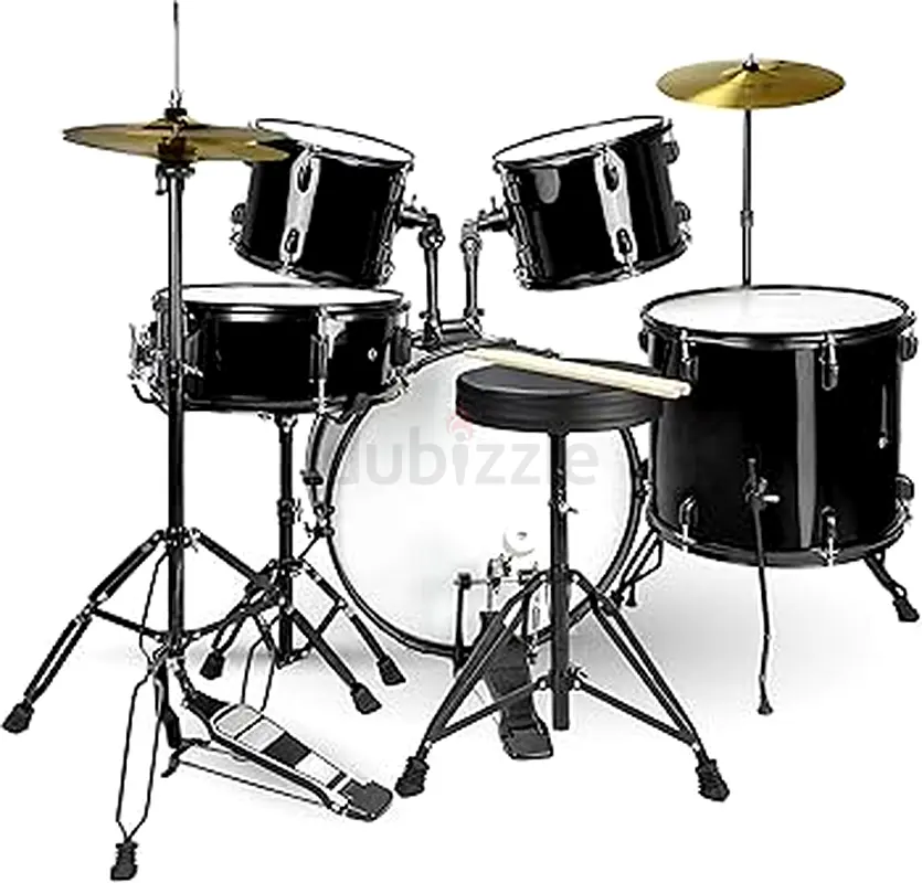 A complete full size adult drum kit that includes everything you need to play right out of the box, including drum throne, drum sticks and bass pedal.