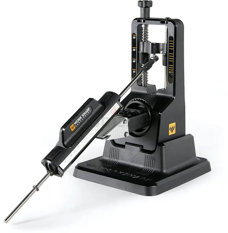 The work sharp precision adjust knife sharpener is an angle guided, 3-sided abrasive jig-and-clamp style sharpener that makes manual sharpening faster, easier and more precise than ever