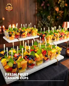 A beautifully curated spread featuring gourmet finger sandwiches, mini sliders, artisan chocolates, fresh fruit cups, healthy fruit cakes, crackers, nuts, and refreshing fruit drinks. Thoughtfully styled for birthdays,